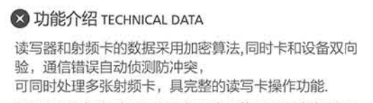 适用范围:配套磁卡锁 读写器和射频卡的数据采用加密算法,同时卡和设备双向验,通信错误自动侦测防冲突,可同时处理多张射频卡,具完整的读写卡操作功能.